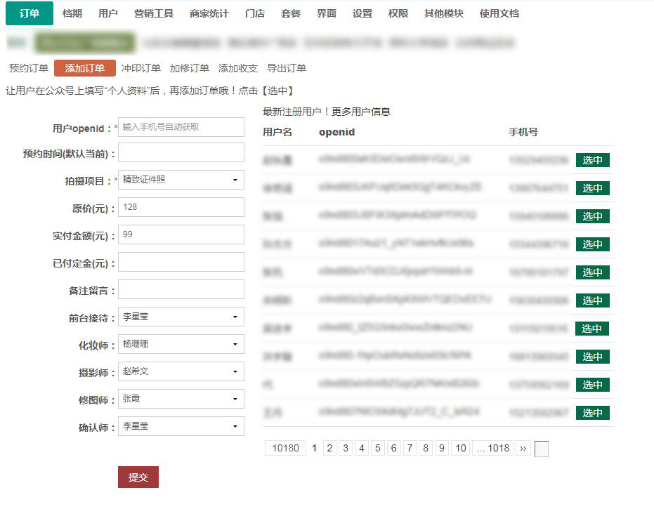 | 2020.01.21更新記錄: 1、大量?jī)?yōu)化了后臺(tái)界面,使用更簡(jiǎn)單。體驗(yàn)更好。 2、手動(dòng)添加訂單更人性化,增加了輸入手機(jī)號(hào)自動(dòng)獲取用戶(hù)、增加了選中套餐自動(dòng)調(diào)用價(jià)格,增加了右側(cè)用戶(hù)列表可直接選中添加。 3、美團(tuán)預(yù)約入口增中了選項(xiàng):固定訂金、無(wú)訂金、調(diào)用套餐訂金(用于默認(rèn)全款)三種。 4、增加了一款套系列表頁(yè)。與首頁(yè)樣式5相似。 5、增加了后臺(tái)配色 6、前臺(tái)配色增至80款。 |